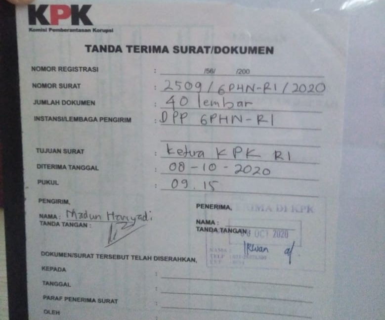 JAKARTA, INDONESIAPARLEMEN.COM –Ketua Umum Lembaga Swadaya Masyarakat Gerakan Penyelamat Harta Negara Republik Indonesia (LSM GPHN RI) Madun Hariyadi mendatangi Kantor Komisi Pemberantasan Korupsi (KPK) Senin, (23/11/2020). Kedatangannya ini merupakan kedua kalinya setelah pada bulan Oktober lalu ia juga mendatangi KPK untuk menyerahkan bukti dugaan tindak pidana korupsi di tubuh Kementerian Pertanian. Surat pengaduan dengan jumlah 40 lembar itu sudah diterima oleh bagian Pengaduan Masyarakan (Dumas) dengan nomor surat 2509/GPHNRI/2020.