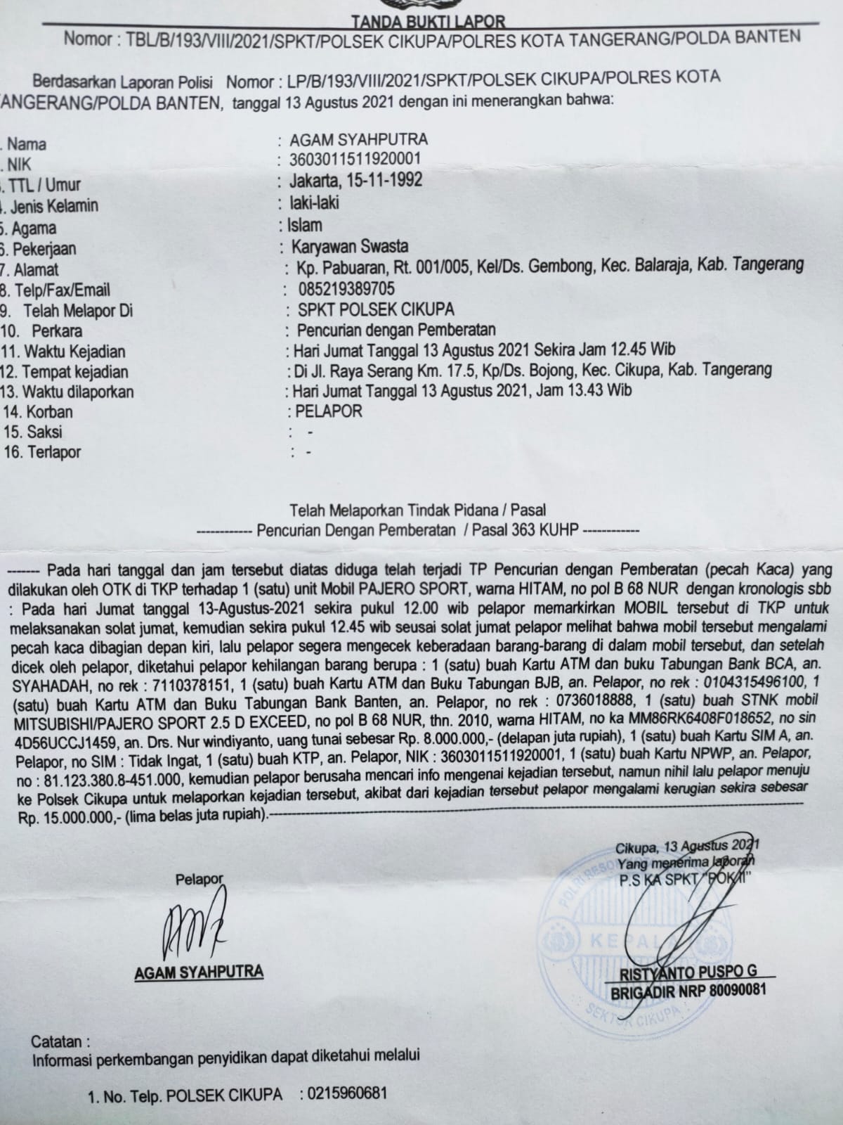Lanjut Agam menambahkan, Dirinya mengaku sudah melaporkan kejadian tersebut ke Polsek Cikupa bedasarkan Nomor Laporan Polisi : LP/B/193/VIII/2021/SPKT/POLSEK CIKUPA/POLRES KOTA TANGERANG BANTEN. Tanggal 13 Agustus 2021.